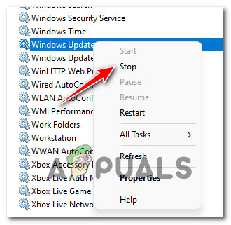 - Once you’re inside the Services screen, move over to the right-hand section and scroll down through the list of services until you locate the main Windows Update service.