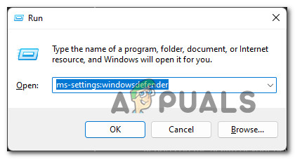 - Next, press Windows key + R to open up a Run dialog box. Next, type ‘ms-settings:windowsdefender’ inside the text box and press Enter to open up the Windows Security page inside the Settings screen.