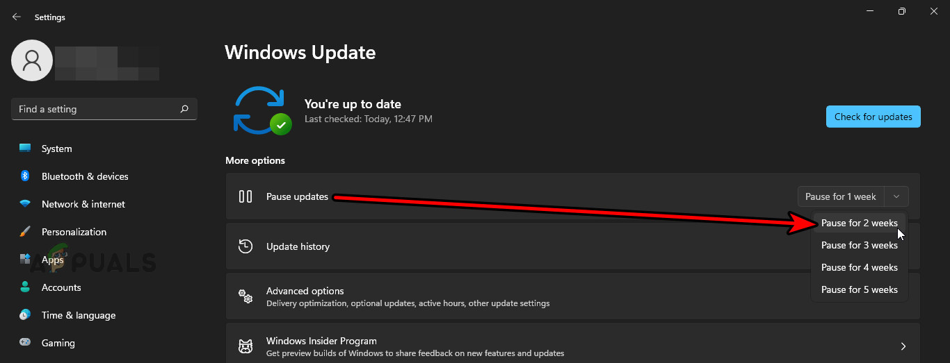 3. Choose Pause for 1 Week from the dropdown menu and then restart your computer. Pause the Windows Update for 2 Weeks
