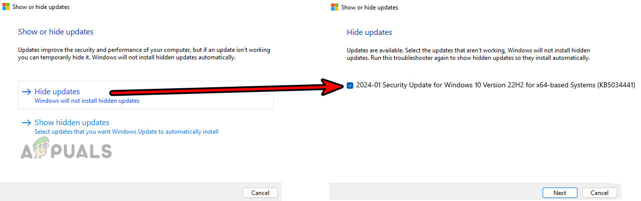 2. Run the tool and choose the Hide Updates option. Hide the KB5034441 Update