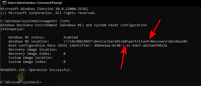 4. Note the path to the Windows RE Location. The Recovery Partition is typically located on Disk 0, Partition 4 in the following path: