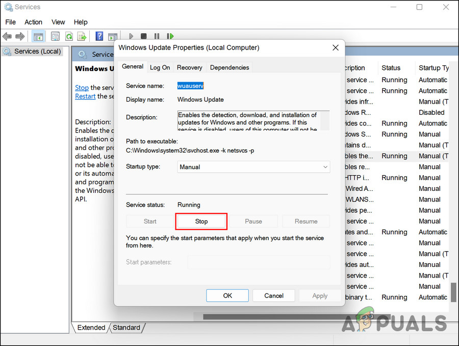 Access properties of the Windows Update service - In the Properties dialog, click on the Stop button.