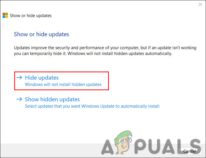 - Once the troubleshooting process is complete, select Hide Updates and select the problematic update from the list of available updates.