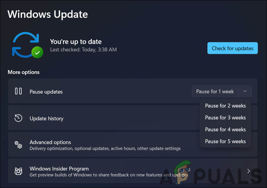- Navigate to the More options section and expand the dropdown for Pause updates.