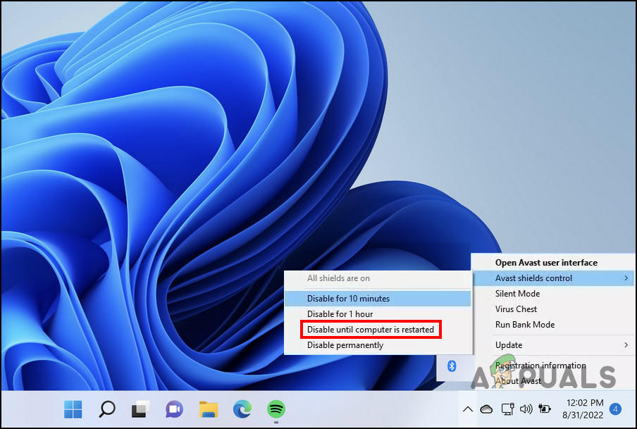 2. From the context menu, choose Avast shields control > Disable until the computer is restarted. Disable the antivirus temporarily