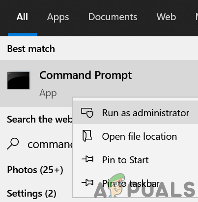 - Click Windows and search Command Prompt. Now right-click on the result of Command Prompt and in the sub-menu, select Run as Administrator.