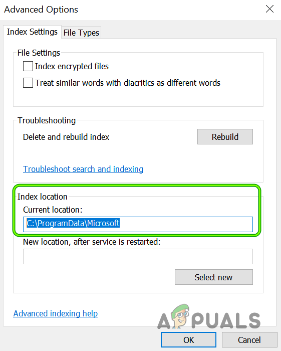 Open Advanced Indexing Options - Now make sure the Current Location under Index Location is set to the following path (you may use the Select New button to set it if the path is a different one):