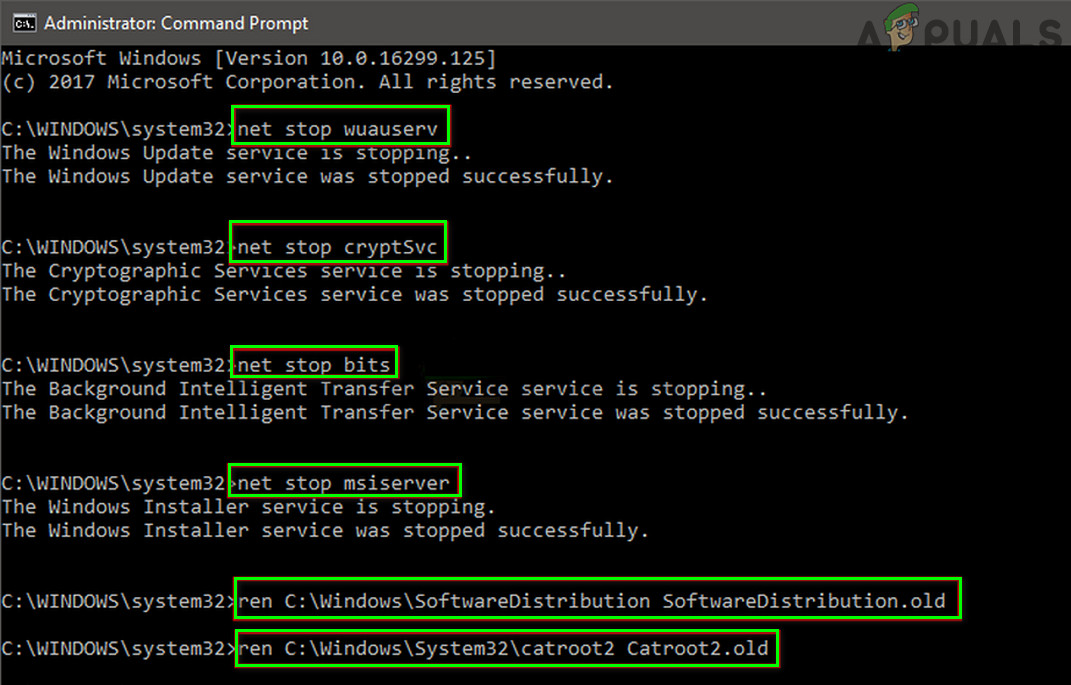 net stop wuauserv net stop cryptSvc net stop bits net stop msiserver ren C:\Windows\SoftwareDistribution SoftwareDistribution.old ren C:\Windows\System32\catroot2 Catroot2.old net start wuauserv net start cryptSvc net start bits net start msiserver
