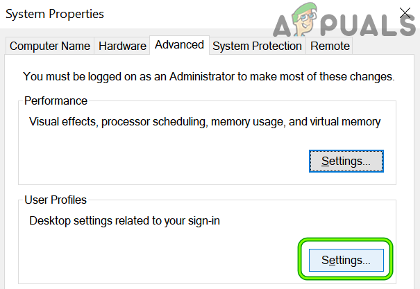 Open Advanced System Settings - Then open View Advanced System Settings and under User Profiles, click on Settings.