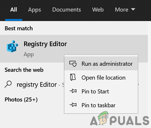 - Now right-click on Registry Editor and in the sub-menu, click on Run as Administrator.