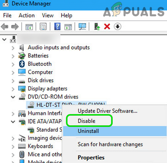 5. Now select Disable Device and then confirm to disable the DVD drive. Disable DVD Device in the Device Manager