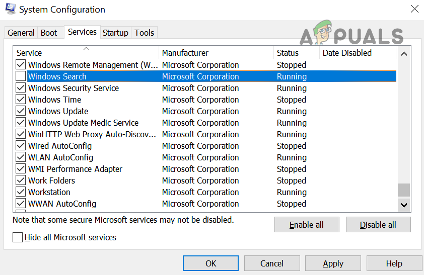 2. Now, in the Services tab, uncheck Windows Search and apply your changes. Disable Windows Search in the Services Tab of the System Configuration