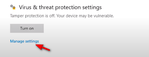 3. Click on Manage settings under Virus & threat protection settings. Managing Virus and Threat Protection settings