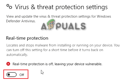 4. Disable Real-time protection by toggling it off. Turning Real-time protection Off