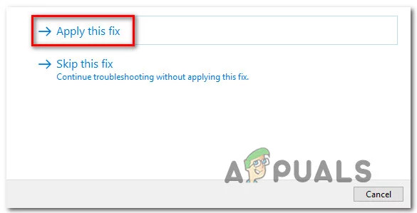 When asked by the Windows Update Troubleshooter, click Next and wait for the initial scan to complete. - Click Apply this Fix if you find a possible solution to implement it in the current situation.