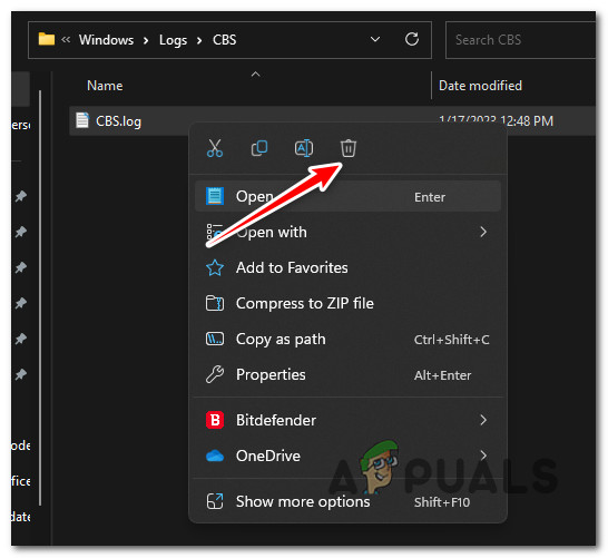 - Inside the location, delete the cbs.log by right-clicking on it and clicking Delete from the context menu.