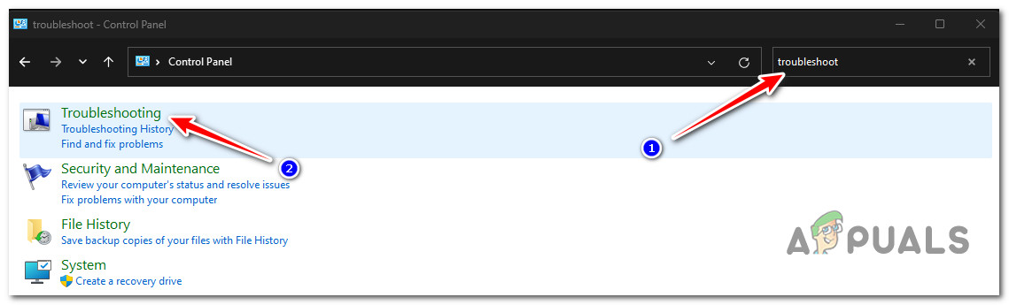 - Utilize the Control Panel’s search function to look for “troubleshoot” (top-right corner of the screen).