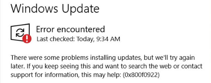 Error Code 0x800f0922 Screenshot – Installing Failed