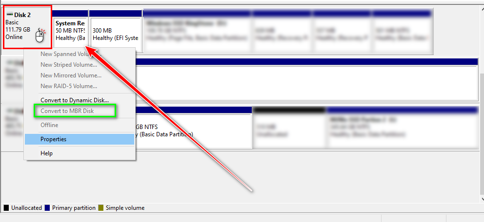 Note: This is important, once you right-click on the disk. Check if the option that’s highlighted with green box says “Convert to MBR Disk” or “Convert to GPT Disk”.