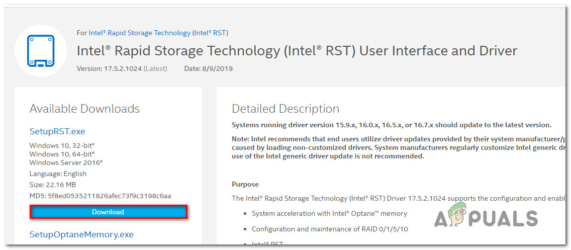 Downloading the latest version of the Intel RST driver - Inside the driver screen, look at the left section of the screen (under Available Downloads) and click on the Download button associated with SetupRST.exe.