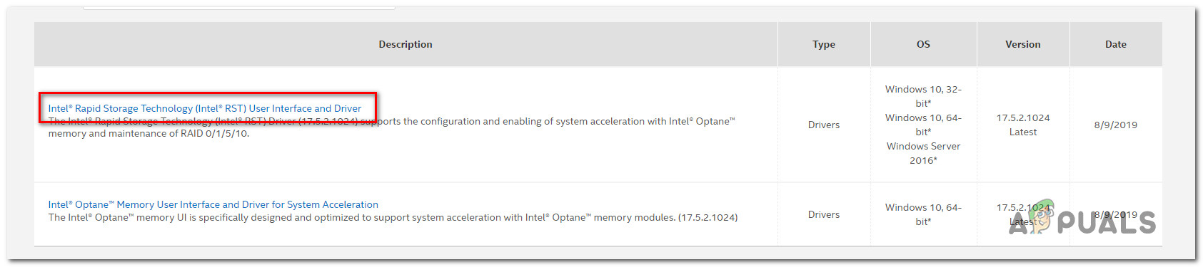 - Visit this link (here) and click on Intel Rapid Technology (Intel RST) User Interface and Driver from the list of available drivers.