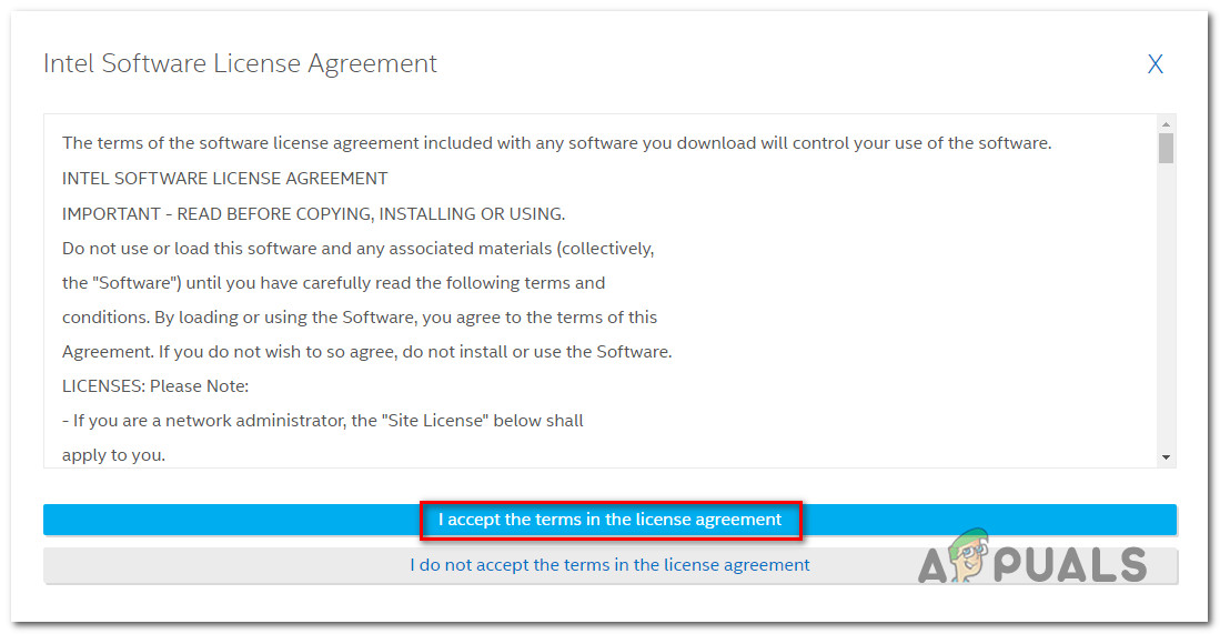 Downloading the Intel Rapid Storage Technology driver - At the Intel Software License Agreement prompt, click on I accept the terms and license agreement. Then, wait for the download to complete.