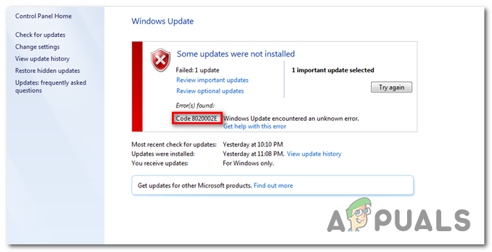 The 8020002e error code typically occurs when the user tries to install a critical or security update using the WU component. Most affected users see it a few seconds after trying to initiate the download of a pending update. This particular error code signals that some vital component needed for the updating process is corrupted or unregistered.