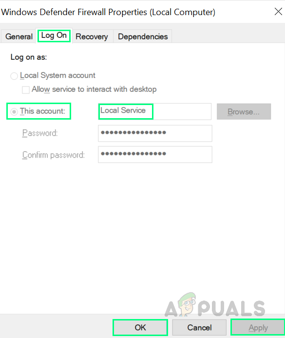 Opening Windows Defender Firewall Properties - Switch to the Log On tab, select the This account option and type Local Service in the available field. If your system is password protected then type your password twice in the respective fields and click Apply. This will help your Microsoft Account to have the authority to enable Windows Defender Firewall on your PC.
