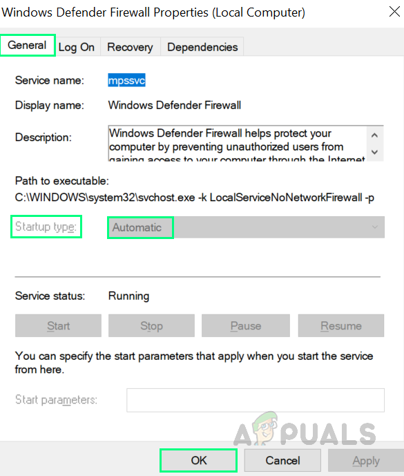 Authorizing Microsoft Account for Windows Defender - Switch to the General tab, set Startup type to Automatic from the drop-down menu, and then click OK. This will finally enable the Windows Defender Firewall Services on your device which will help you get rid of the encountered error.