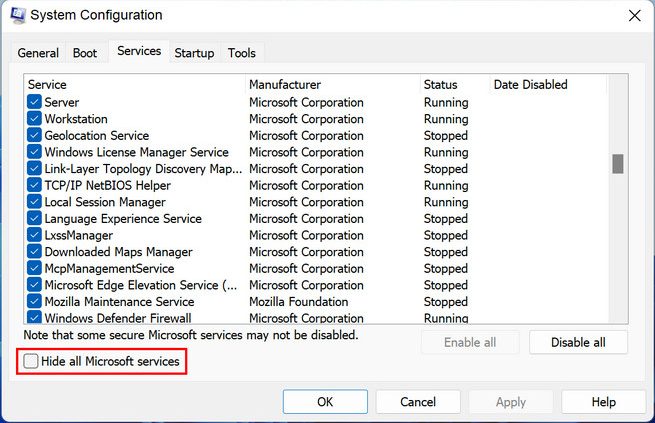 2. Go to the Services tab and check () Hide all Microsoft services, then click Disable all.