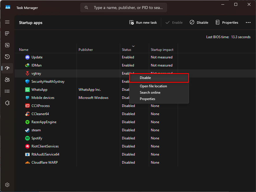 3. Switch to the Startup tab and click Open Task Manager. Disable all startup items. Disable all startup programs.