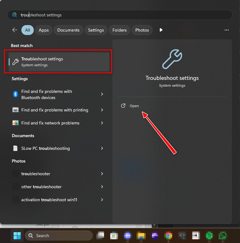 1. Press the Windows Key and type Troubleshoot settings, and press Enter.