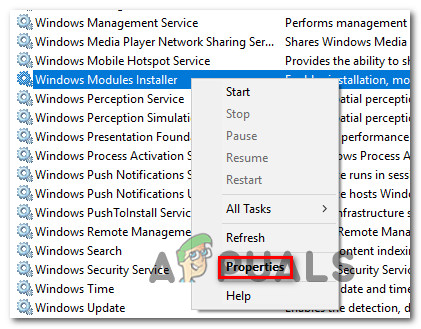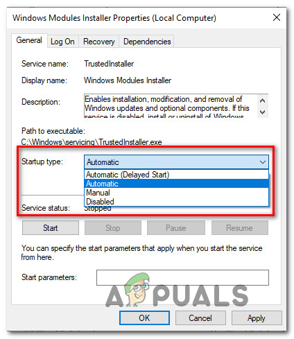 • Windows Module Installer is disabled – As reported by various users, this error code can also occur in instances where a critical process (Windows Module Installer) is disabled (either by manual user intervention or by a resource manager software). In this case, you can resolve the issue by accessing the Services screen and re-enabling the Windows Module Installer service.
