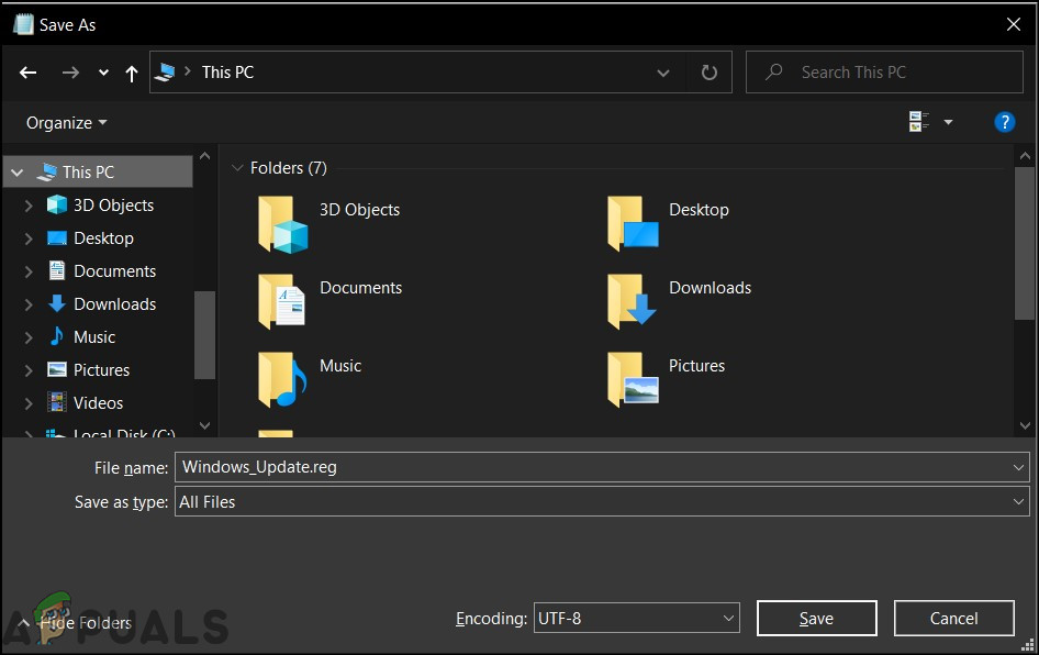 1. Secondly, set Save as type: to All Files. Save as .reg file