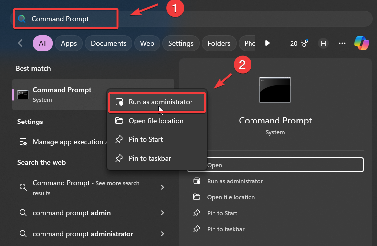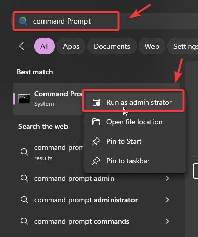 1. Open Command Prompt as an admin by typing it into the Start Menu and right-clicking on it.