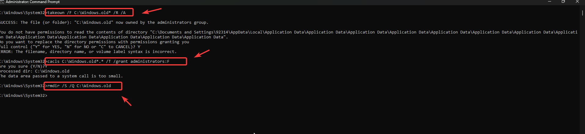 2. In Command Prompt, enter these commands to take ownership and delete the Windows.old folder: