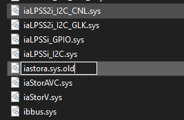 5. Rename the iastora.sys to iastora.sys.old to force Windows to disregard it.
