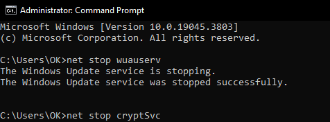 2. Enter the following commands one by one, pressing Enter after each to stop the Windows Update services: