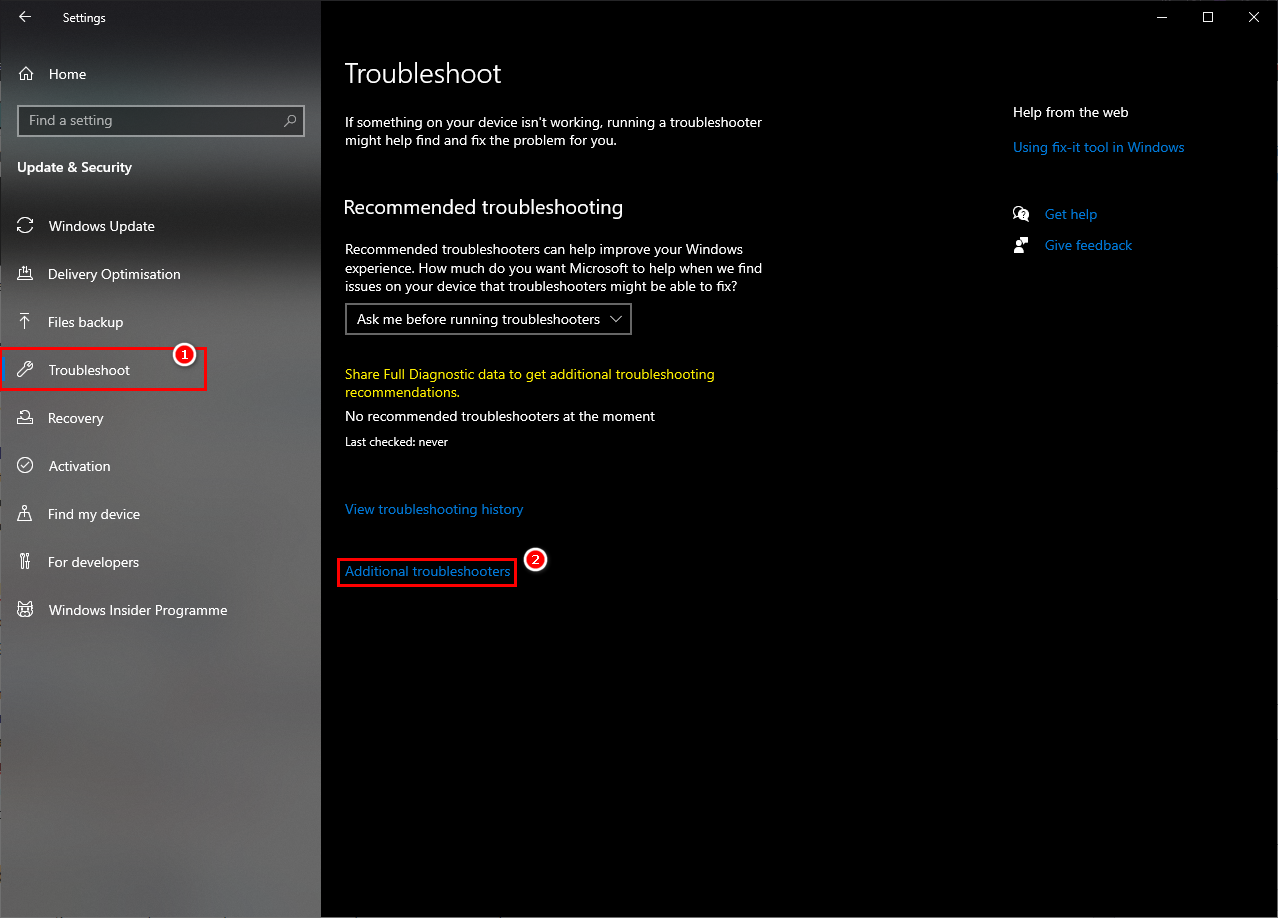 2. Select Troubleshoot from the left pane.