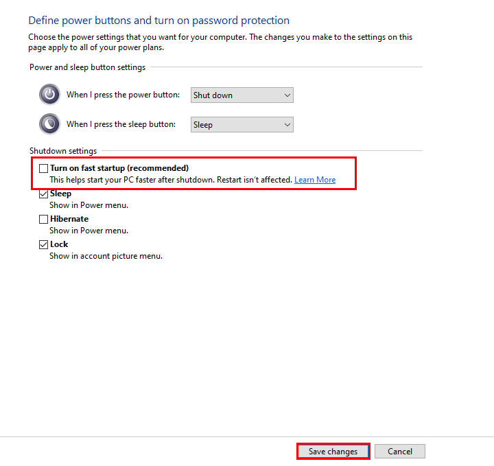 4. Deselect Turn on fast startup (recommended) under Shut-down settings and click Save changes.