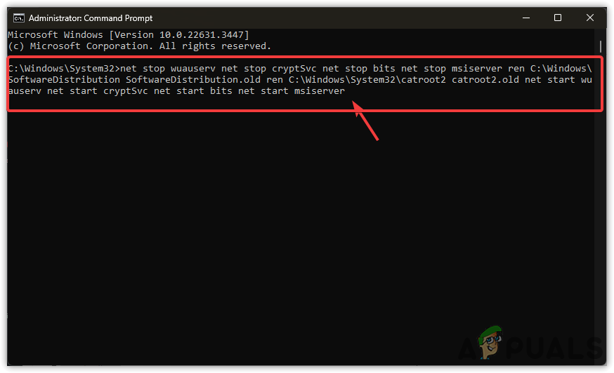net stop wuauserv net stop cryptSvc net stop bits net stop msiserver ren C:\Windows\SoftwareDistribution SoftwareDistribution.old ren C:\Windows\System32\catroot2 catroot2.old net start wuauserv net start cryptSvc net start bits net start msiserver