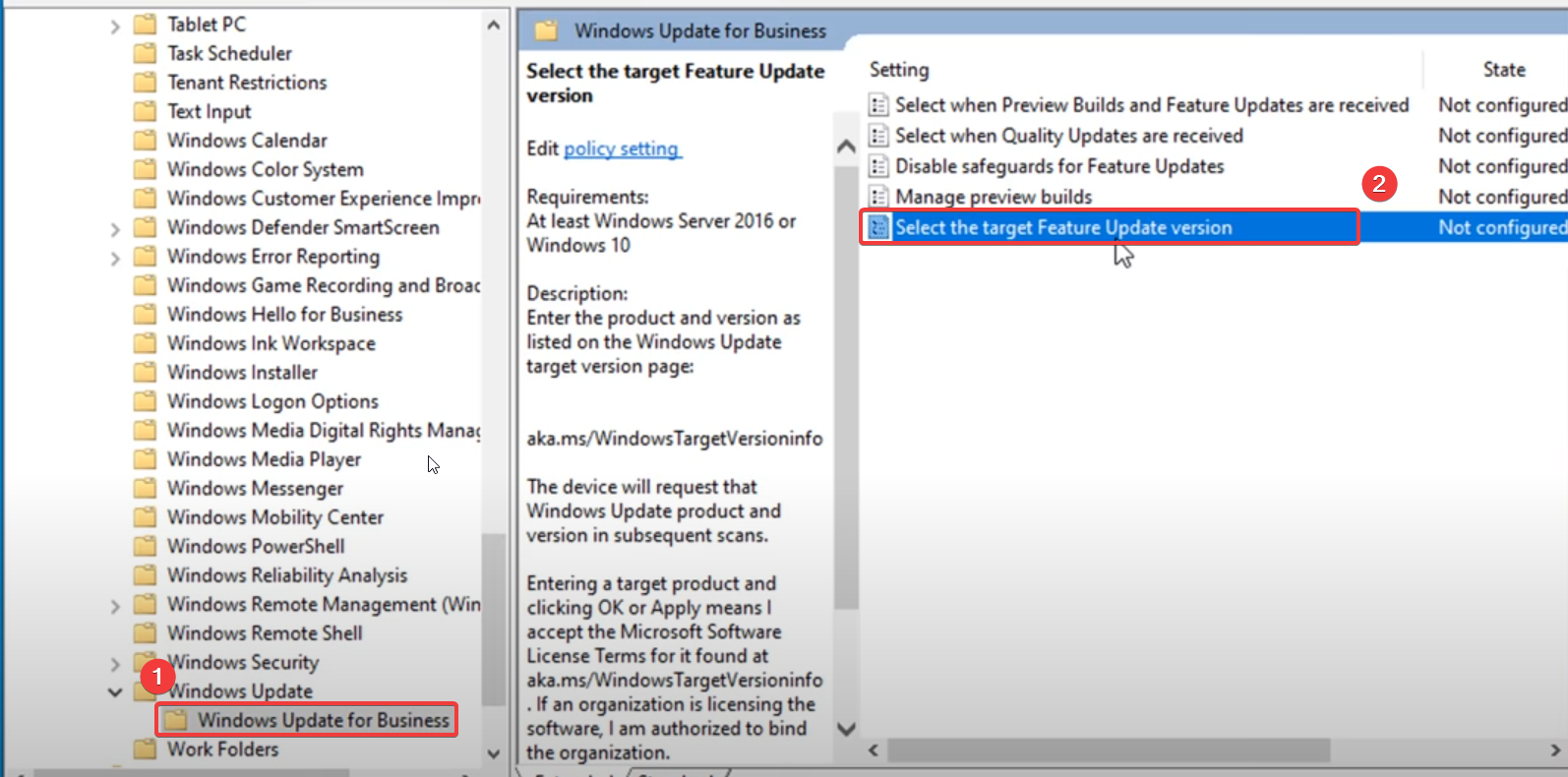 4. In the right pane, you will see Select the target Feature Update version. Double-click on it to view its settings.