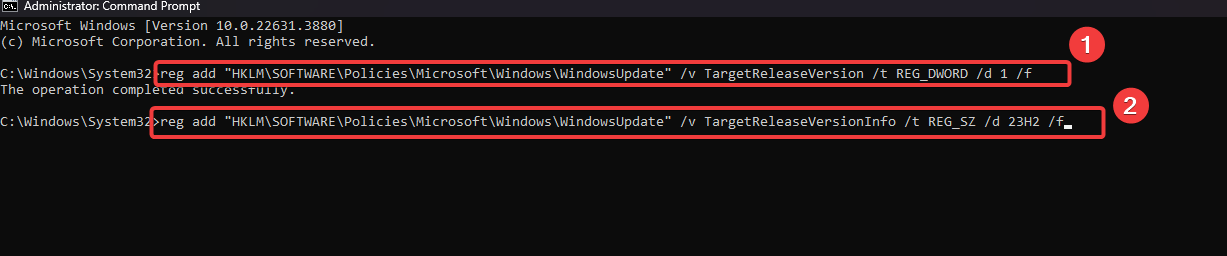 reg add "HKLM\SOFTWARE\Policies\Microsoft\Windows\WindowsUpdate" /v TargetReleaseVersionInfo /t REG_SZ /d 23H2 /f