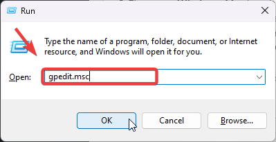2. Type gpedit.msc in the input box and click OK to open the Group Policy Editor.