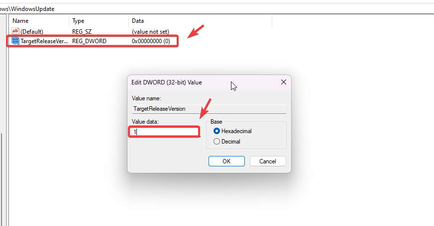 reg add "HKLM\SOFTWARE\Policies\Microsoft\Windows\WindowsUpdate" /v TargetReleaseVersion /t REG_DWORD /d 1 /f