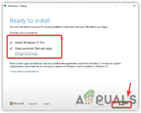 - Once done, now at the next Window, ensure that the Install Windows 11 Pro and Keep Personal Files And Apps are checked. In case one of them is unchecked, click Change What To Keep and select both options to continue