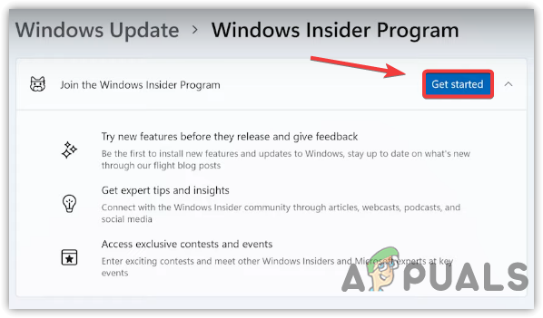 Navigating to Windows Insider Program Settings - Click Get Started to join the Windows Insider Program