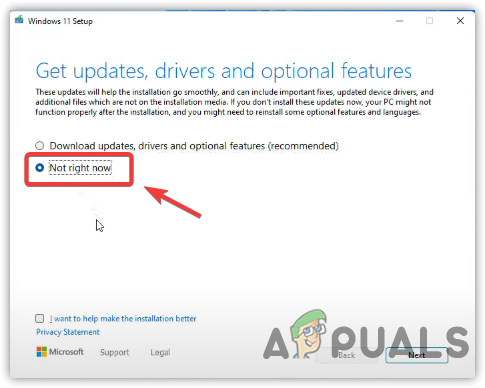 Changing How Setup Downloads Windows Updates - Select Not Right Now to speed up the upgrade process