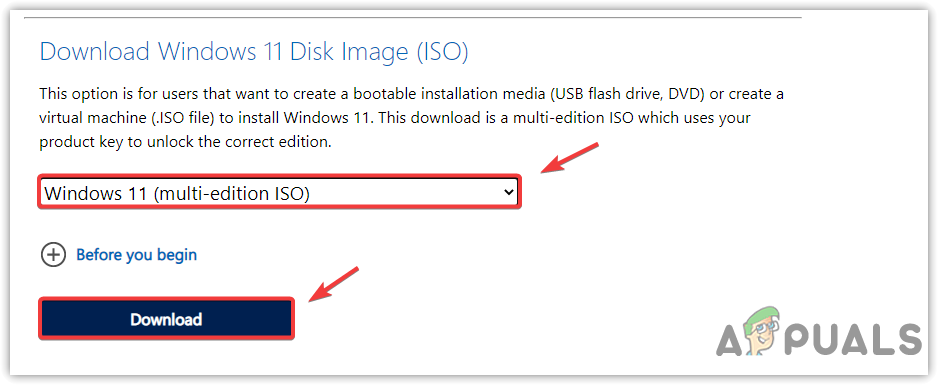 Note: You will be able to see the current version on top, which should be the Windows 11 2022 Update Version 22H2 - Scroll down to the Download Windows 11 Disk Image (ISO)