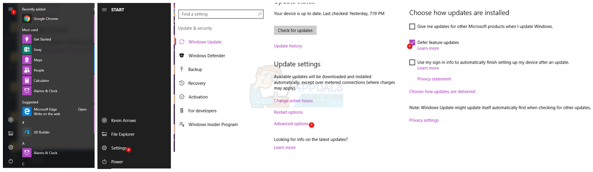 - Click the Start button, click options (three horizontal lines icon), Settings (from drop down menu), Update & security, Advanced options. Check the box before Defer Feature Updates.